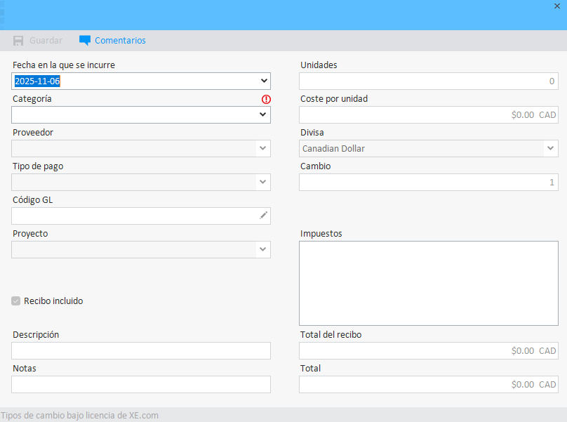 Tipo de cambio - si el gasto fue en una moneda diferente, el campo Tipo de cambio mostrará la tasa de cambio para la moneda seleccionada según la licencia de XE.com.