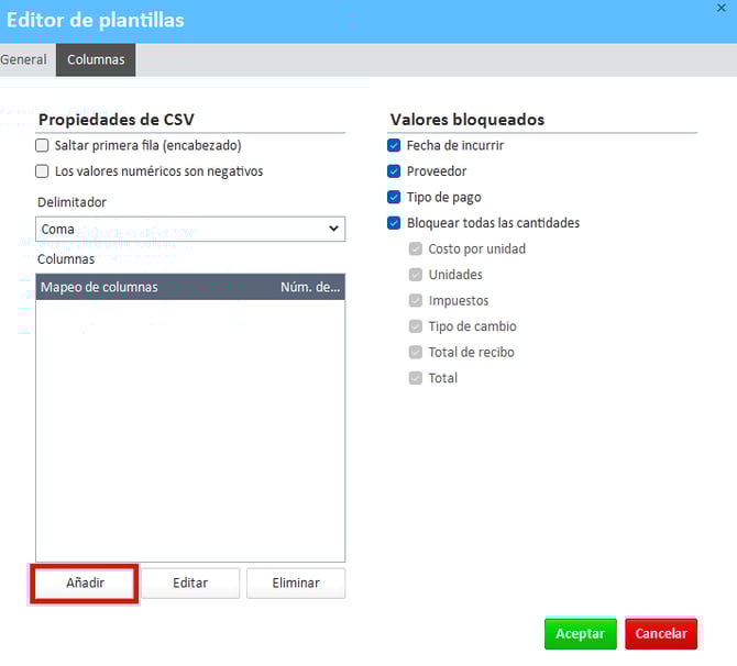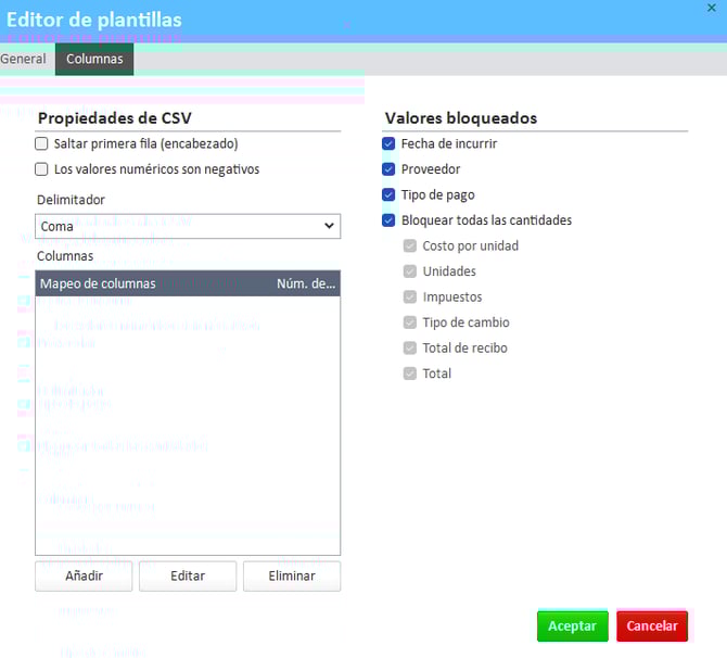Bajo la pestaña Columnas, puedes configurar las columnas del informe para que coincidan con el archivo importado para tus transacciones.
