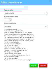 Al agregar los campos a tu archivo importado, para algunos campos, por ejemplo, campos de fecha, es posible que necesites configurar el formato adicionalmente a través del Editor de formato de fecha para garantizar una lectura precisa del archivo.