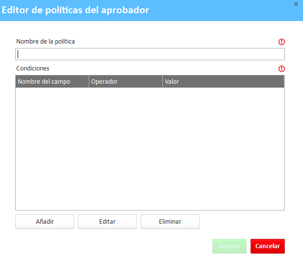 Esto abrirá la ventana Editor de política de aprobador, permitiéndote crear la nueva condición.