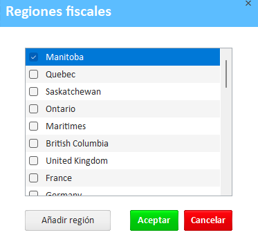 - Región - selección múltiple permitida. Esta área puede tener varias tasas según donde te encuentres. Ejemplo: la tasa GST de Canadá afecta a BC, AB, SK, MB y QC. Nota: El país de IVA sería la Unión Europea, y la región serían los países que tienen el mismo porcentaje de IVA Si falta una región requerida, puedes crear una. Para agregar una región, haz clic en el botón Agregar región.