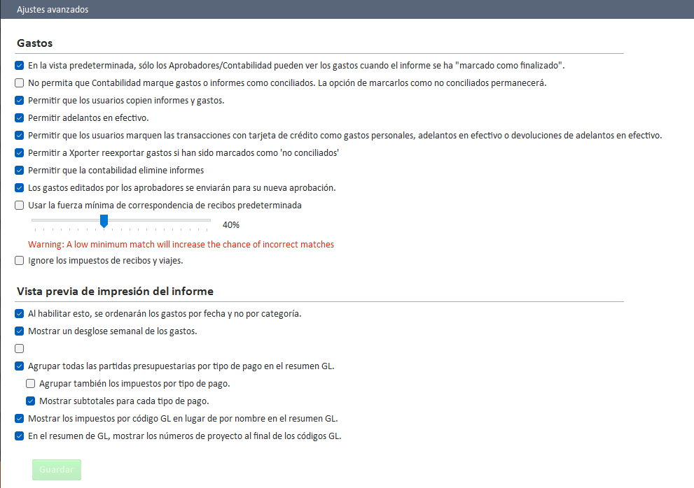 - Usar nivel mínimo predeterminado de coincidencia de recibos - por defecto, el mínimo está establecido en 50%. Desmarca la casilla para poder establecer un % diferente para la coincidencia. Una vez hecho, no olvides marcar la casilla nuevamente. Cada opción tiene una casilla para marcar/habilitar cualquiera de estas configuraciones. Por defecto, todas las opciones están habilitadas una vez que configuras tu cuenta (excepto los gastos conciliados)