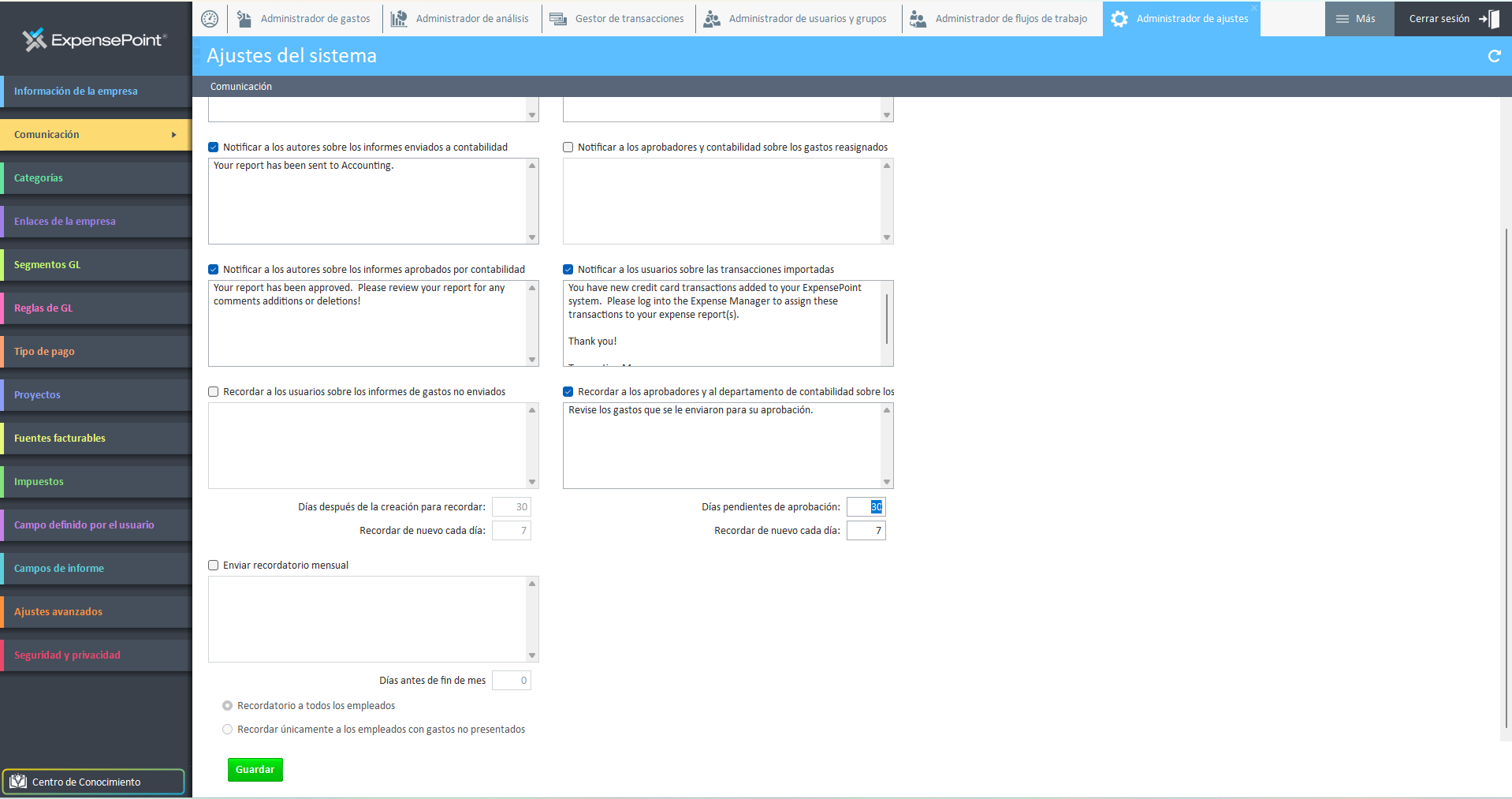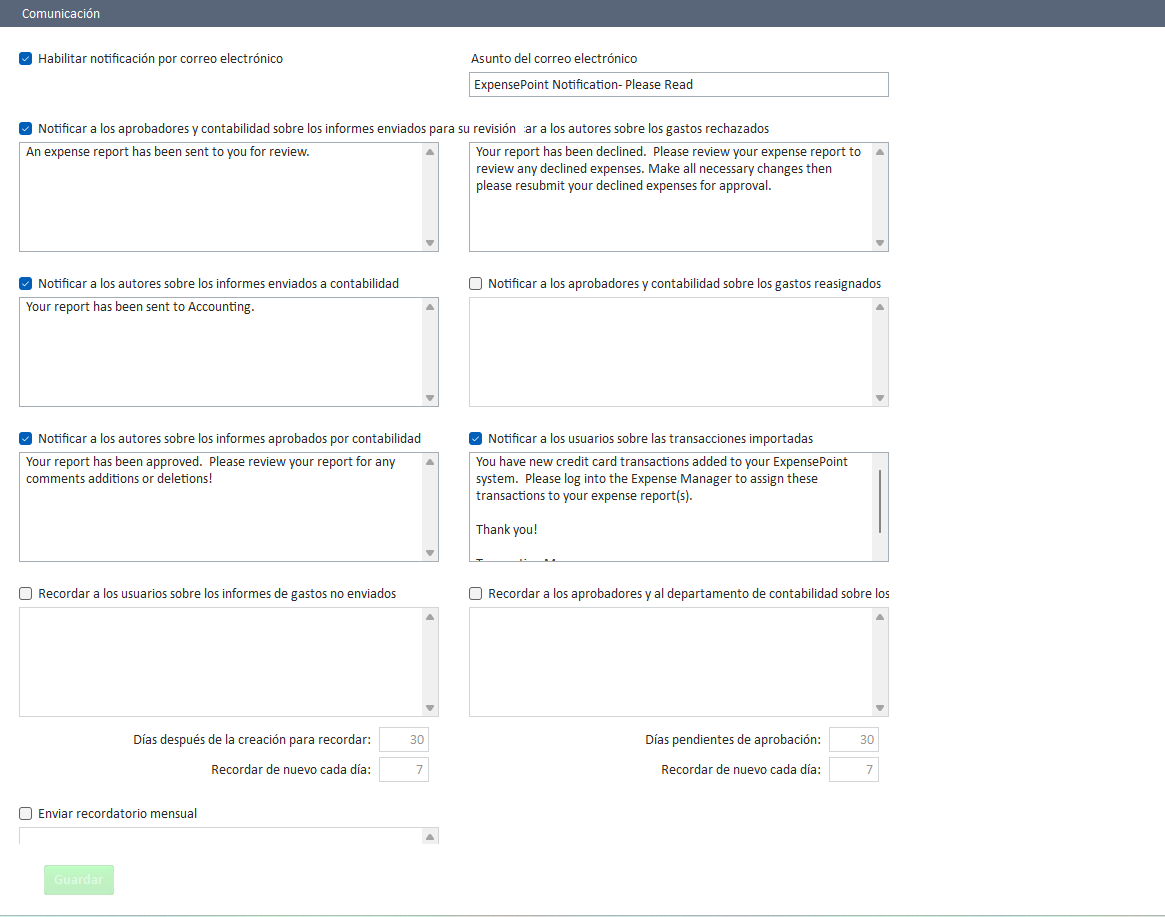 - Notificar a los autores sobre informes enviados a contabilidad – recomendamos no activar esto a menos que los empleados no estén satisfechos con la duración de las aprobaciones.