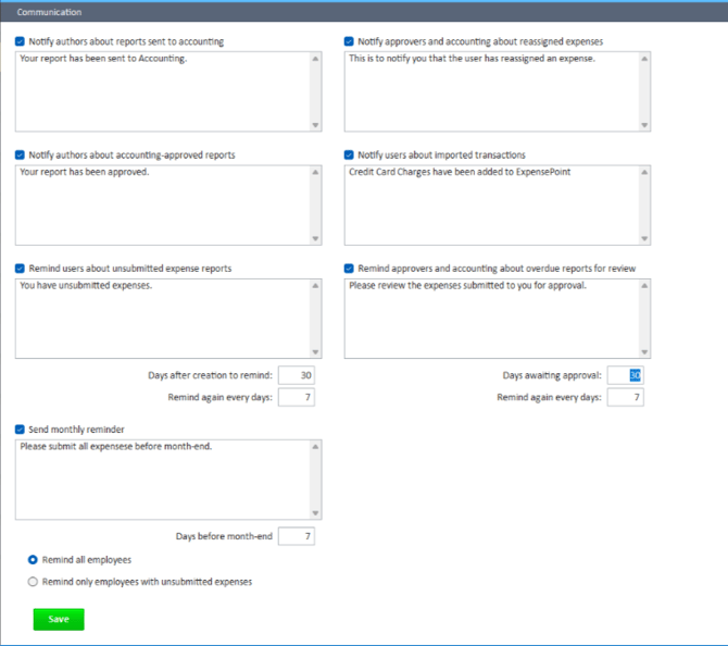 - Notify authors about reports sent to accounting – we recommend not to turn this on unless employees are not happy with the approval durations.