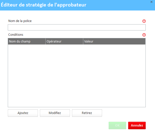 Une fois que vous avez créé la condition depuis l'écran Éditeur de politique d'approbateur, cliquez sur OK pour l'enregistrer.