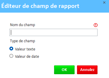Depuis cette fenêtre, vous pouvez saisir le nom du champ de rapport souhaité dans le champ Nom du champ. Selon le type de champ, vous pouvez choisir :