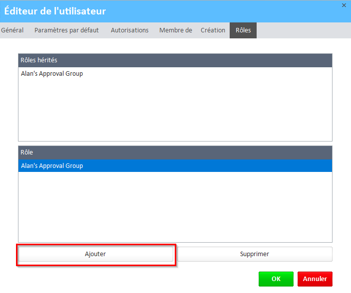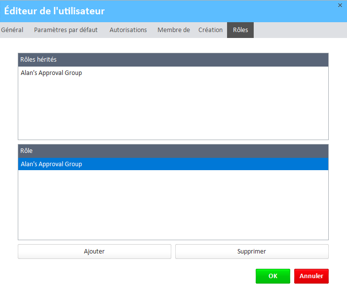 L'onglet Rôles vous permet d'attribuer des rôles à l'utilisateur. Cela peut parfois faciliter la création de groupes d'utilisateurs si vous souhaitez lui attribuer, par exemple, un rôle d'approbateur, au lieu de passer par des autorisations détaillées.